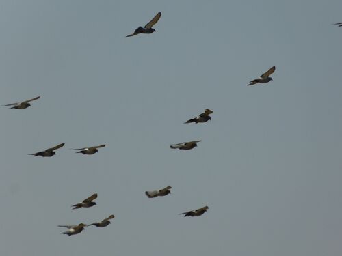 目の前にカワラバト(ドバト)がいてもカメラを向ける気にはならない(←鳥好きを標榜している奴の言いぐさか(笑))。しかし飛んでいる姿は写してみたくなる。集団で田んぼの何かをつついてはさっと飛び立ち、また降りてきて何かついばんでいる。天敵を警戒…